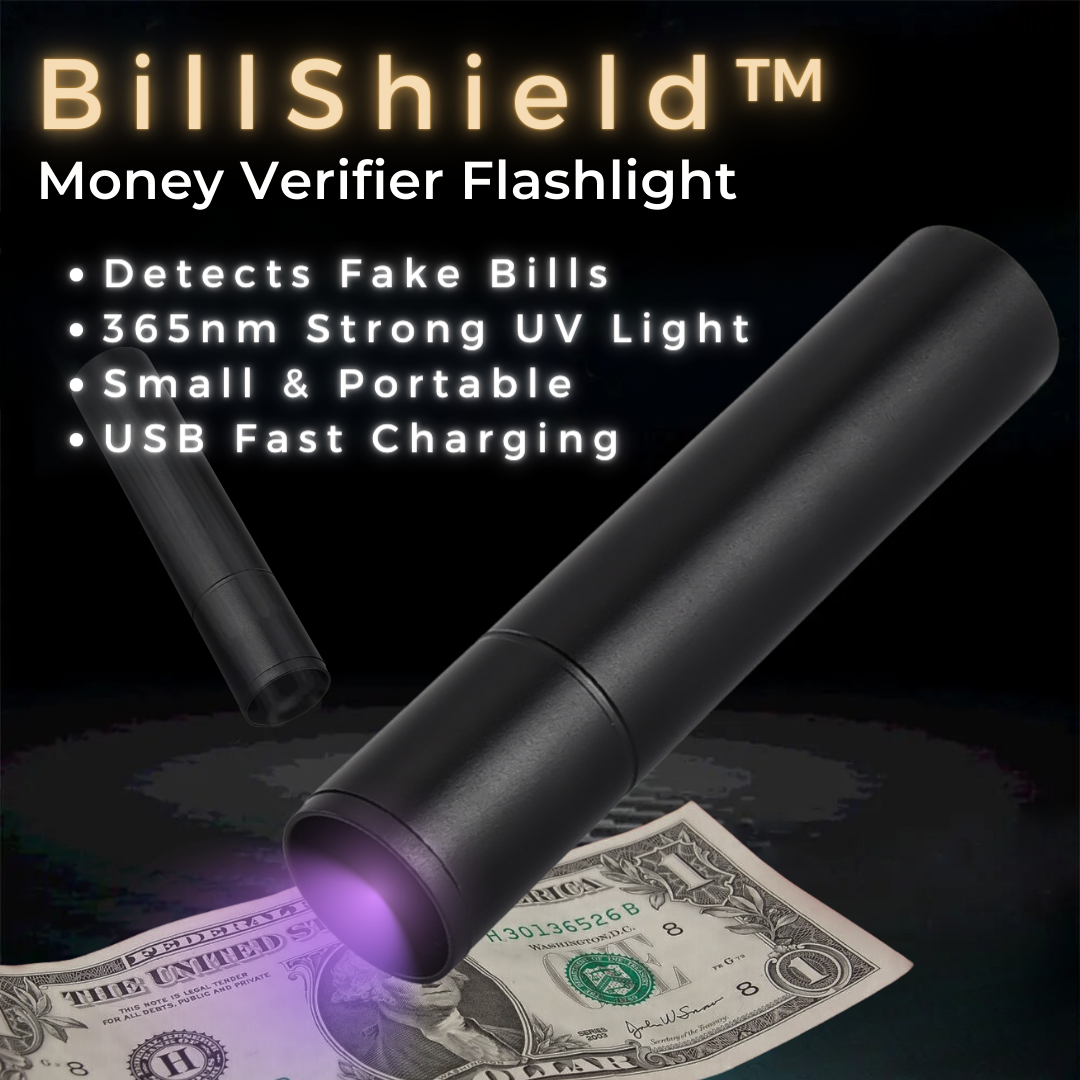 Introducing BillShield™ Money Verifier Flashlight: the ultimate tool for effortlessly detecting counterfeit currency. Engineered with precision, this compact device emits powerful UV light, revealing hidden security features on authentic banknotes, including the elusive security stripe that's impossible for counterfeiters to replicate. With its durable, waterproof design and rechargeable high-capacity lithium battery, BillShield™ ensures reliability and longevity, making it an indispensable companion for businesses and individuals alike. Trust BillShield™ to shed light on authenticity, safeguarding your financial transactions with ease and confidence.