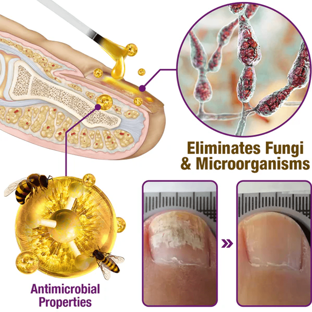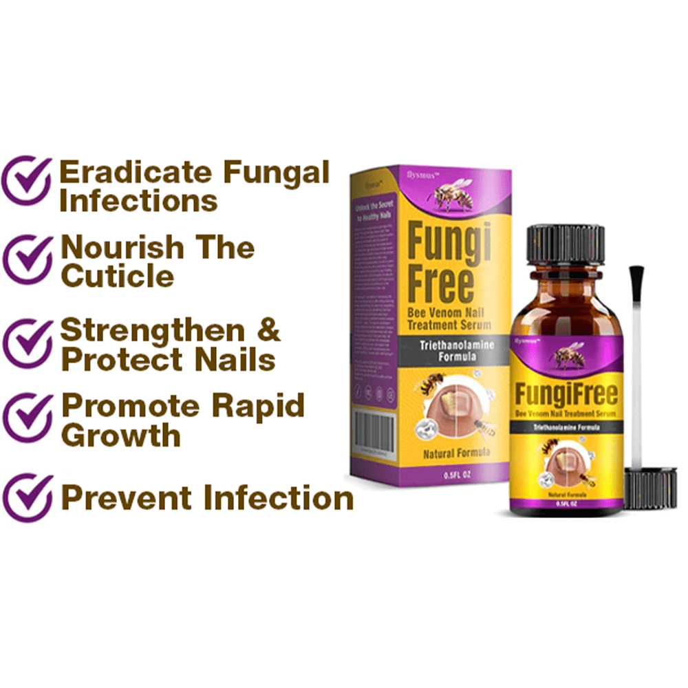 The FungiFree serum features a powerful formula enriched with bee venom, which contains peptides and proteins with strong antimicrobial properties. These bioactive compounds effectively target and inhibit the growth of various microorganisms, including fungi, by disrupting their cellular structures and interfering with their metabolic processes. This provides a potent solution for maintaining healthy, fungus-free nails.