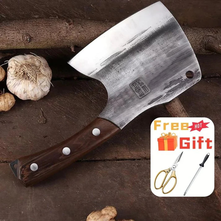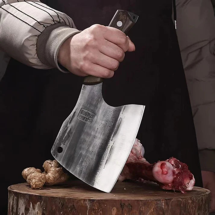 This artisan handcrafted vanadium steel AXE knife is a beast! The razor-sharp blade is tough and aggressive. It can hack through hard meat and bones like butter, and seamlessly chops hardy vegetables. Simply put, this blade will glide straight through anything you throw at it.