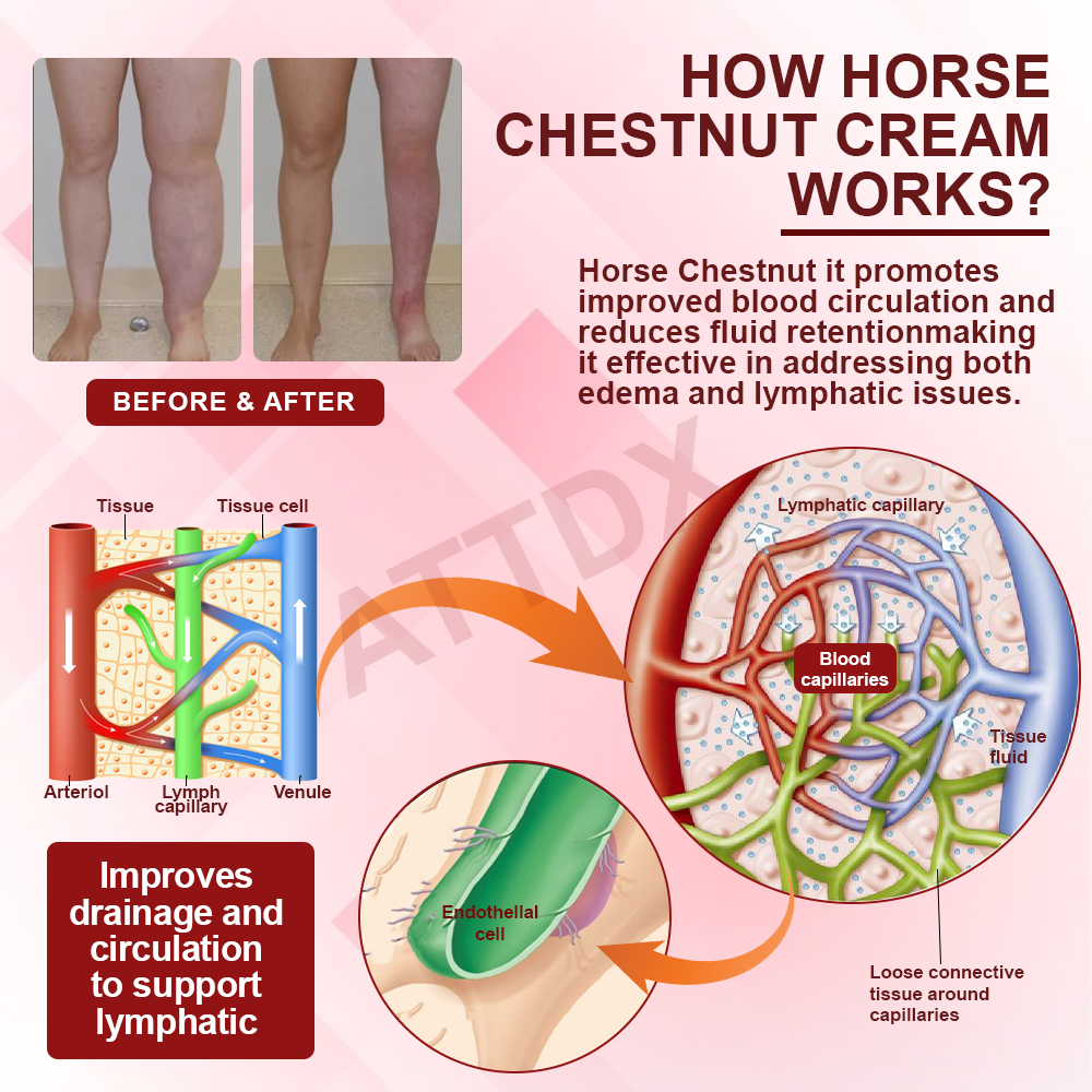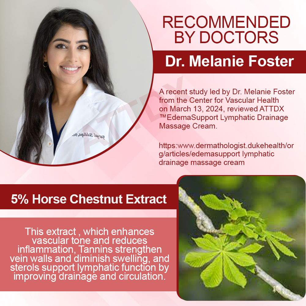 Endorsed by Dr. Melanie Foster from the Center for Vascular Health, a study conducted on March 13, 2024, revealed the effectiveness of EdemaCare™ Kidney Aid Drainage Massage Cream with 5% Horse Chestnut Extract, which contains the active compound Aescin that helps in reducing leg swelling, supports lymphatic drainage, and enhances kidney function.