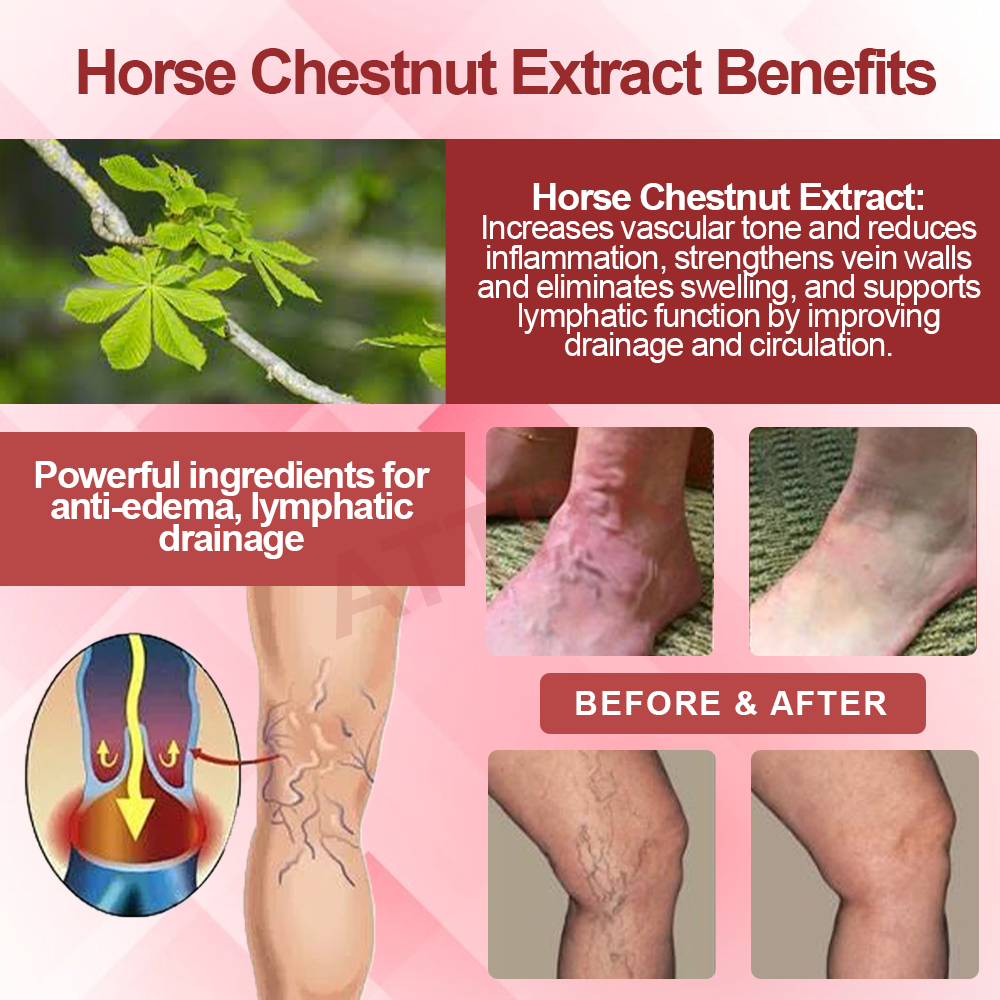 Aescin enhances vascular tone and reduces inflammation, while flavonoids offer antioxidant protection to blood vessels. Tannins strengthen vein walls and diminish swelling, and sterols support lymphatic function by improving drainage and circulation.