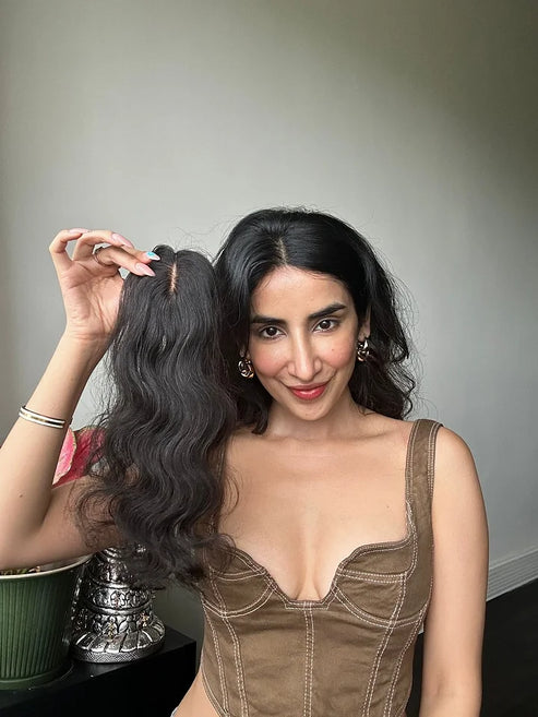 Step 1 - Place the topper where you want your hair parting to be. This can be in the centre or on the side.
