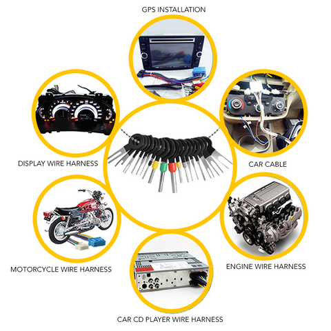 The is a universal tool kit with different pin keys (single pins, double pins and casting tools) for all connector terminals which can be used for cars, motorcycles, other electronic devices etc.